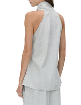 CAMILLA AND MARC Alta Wrap Top in Light Blue Marle is a soft suiting wrap top with draped neckline and cutaway armholes. Secured with a rouleau tie and button.