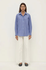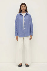 The Anais Stripe Long Sleeve Shirt in blue/white stripe is a 100% cotton shirt with a two-piece collar and double yoke with pleat detail.