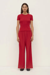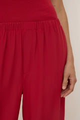 The Betty Silk Pant in mulberry is a relaxed straight leg pant with an elasticated waist and side seam pockets, crafted from 100% lightweight silk.
