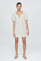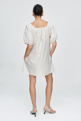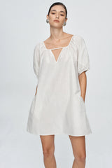 A relaxed mini dress with a gentle A-line shape. The wide square neckline is softened by a narrow strap that creates a subtle v shape cut-out, while balloon sleeves are gathered to lend volume and ease. Designed for a relaxed fit offering an understated sense of femininity and simplicity.