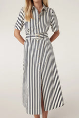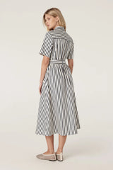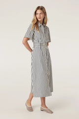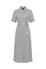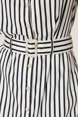 The Lina Stripe Shirt Dress is a regular fit style crafted from crisp cotton sateen. Designed with a button-through front, it features an elasticated back waist, side pockets, and a matching belt with buckle for a defined silhouette.