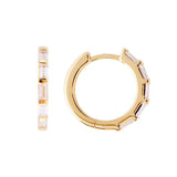 These simply stunning finer mid size hoops comprise sparkling CZ baguette stones set in recycled sterling silver 18k gold plate. An elegant everyday extremely light weight hoop that goes with everything.