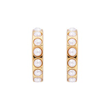 These stunning hoops comprise 5 milky white cabochon crystal pearls encrusted in an 18k gold plated sterling silver hoop. An elegant everyday extremely light weight hoop that can be stacked with other huggies and studs.
