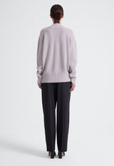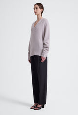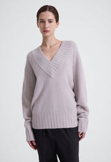 We call this a classic cricket sweater, with an oversized, deep v-neckine, exaggerated ribbed detailing and an oversized fit. Made of a wool cashmere blend, and knitted on a chunky guage, this sweater feels warm, cosy and comforting on the body.