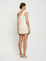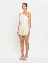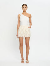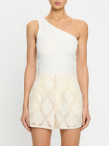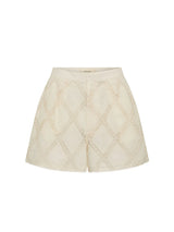 The Izzy Short in cream is crafted in a diamond shape design with crochet inserts featuring a fitted waist complete with front zipper and hook and bar closure.