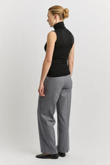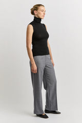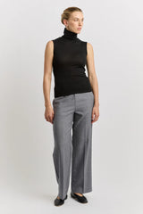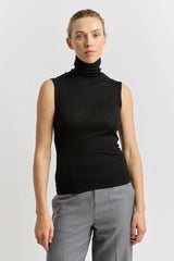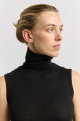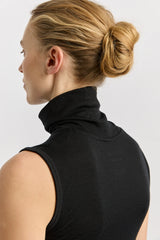 The Sleeveless Roll Neck is a sleeveless style with a soft folded collar. It is designed to fit close to the body and can be worn alone or as a versatile base layer.