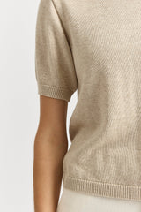 The Short Sleeve Knit has a relaxed silhouette with a round neck accented by a soft roll trim. The elbow-length sleeves are slightly rounded and detailed with a fine rib trim.