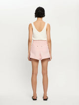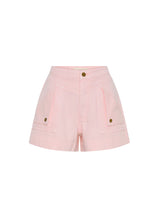 A modern essential, our signature Celene Short in pink features contrast topstitching and panel detailing, front fold over pockets, complete with antique brass logo hardware.