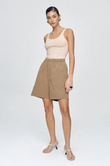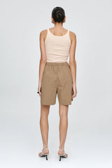 Relaxed-fit shorts crafted from a lightweight 100% cotton selected for its crisp structure and comfort. The design features a fully elasticated waistband for ease of wear and flexible fit. A mock fly is incorporated at the centre front to reference traditional tailoring details while retaining a pull-on construction. The Ren short is equipped with oversized front pockets and finished with a topstitched deep hem.