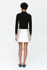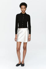 The Piper Skirt is crafted in a luxurious silk / wool. This black mini skirt features a wraparound silhouette, with the top layer sitting slightly longer to create an asymmetric detail. It has an invisible zip and hook and eye closure at the side. This skirt has a flattering, subtle A-line shape. Available in Black and Ivory. Worn with the Foundations Cardigan.