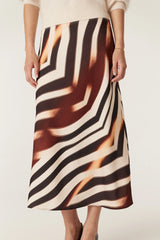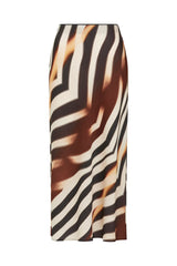 The Sasha Skirt features a regular fit with a flattering bias cut silhouette. Made from a medium weight woven fabric with a subtle sheen, it has an elasticated flat waistband and features an exclusive Zebra print.
