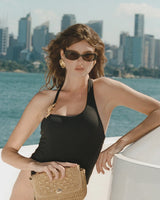 The Helena is a modern take on a classic oval frame with squared edges, creating an elegant and universal shape. Both plant based and polarised this style features signature gold detailed hardware on the temples.