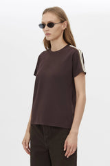 CAMILLA AND MARC Locus espresso brown fitted baby tee with contrast stripe tape. Crew neckline, narrow twin needle hem.
