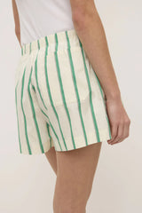 Mid-rise cotton poplin short in a dual stripe design. Features a concealed fly, elasticated waistband and internal waist tie for an adjustable fit. Can be paired with the matching Agnes Stripe Short Sleeve Shirt.
